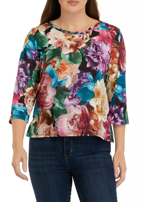 This realistic floral print in lush colors graces a soft knit women’s top. This beautiful style is fashioned with three-quarter-length sleeves and light sparkles at the braided crew neck.