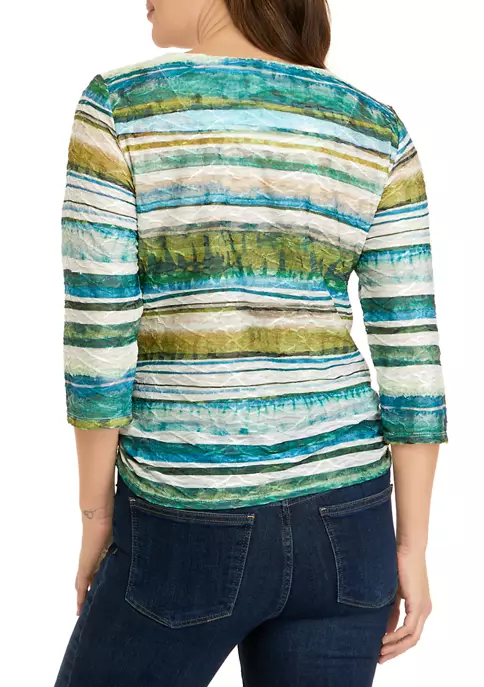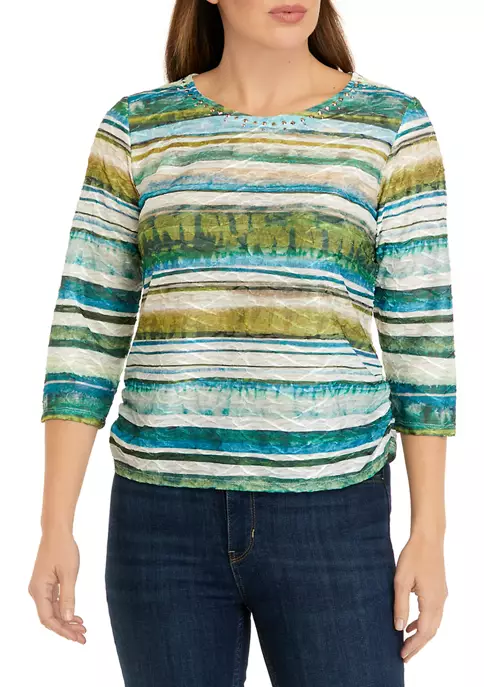 A textural surprise on this watercolor biadere print women’s top makes this style trendy. The shirring at the side seams creates a flattering hemline on this three-quarter-length sleeve knit top. An embellished crew neck completes this look.