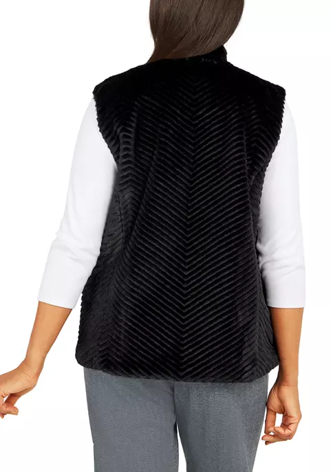 Feel the softness of the season when wearing this luxe chevron faux fur vest by Alfred Dunner, featuring a sleeveless style and side pockets.