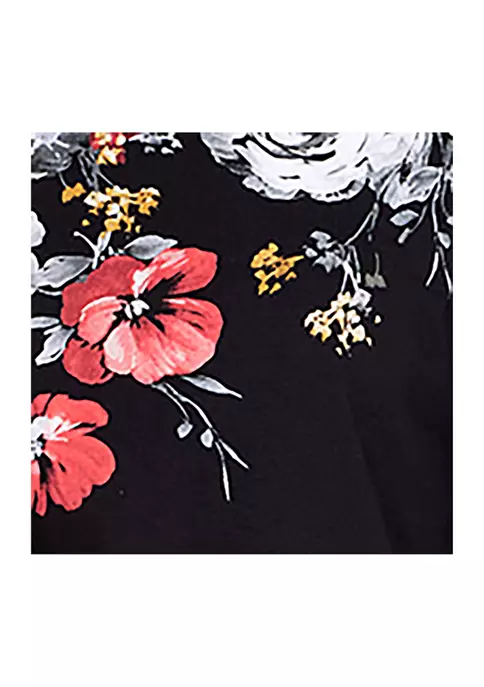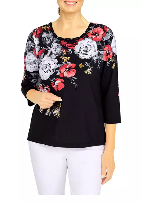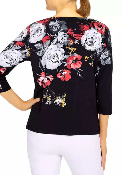 The gorgeous realistic floral print decorates this soft knit top. Features 3/4 sleeves and a braided crew neck.