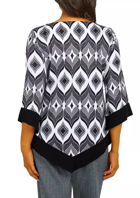 This art deco geo-print texture top is designed to flatter your figure from every angle. Features flowy bell sleeves, an asymmetrical hemline, and a detachable necklace at the crew neck.