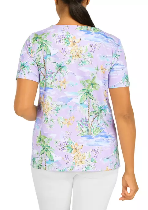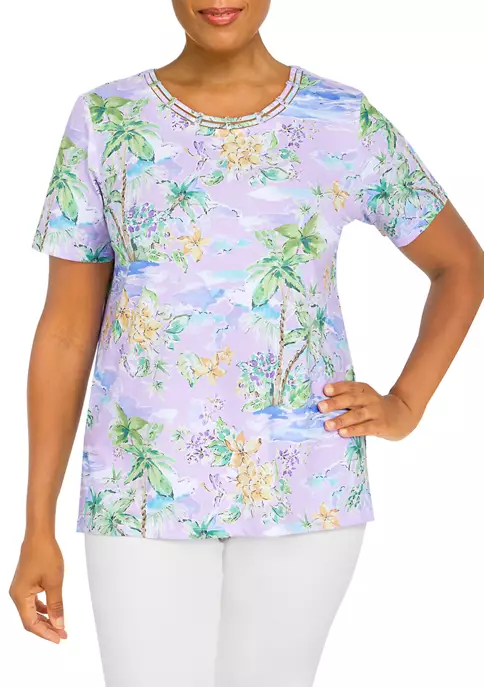 Take a vacation with the Alfred Dunner island tropical scene print. This knit top features an embellished double strap neckline detail and short sleeves.