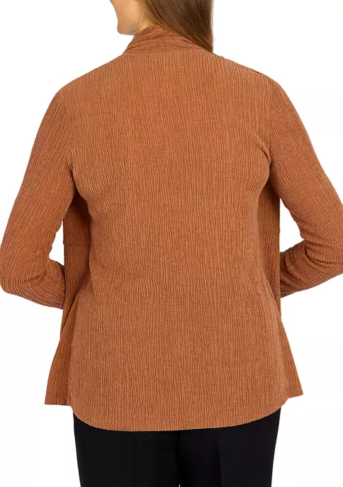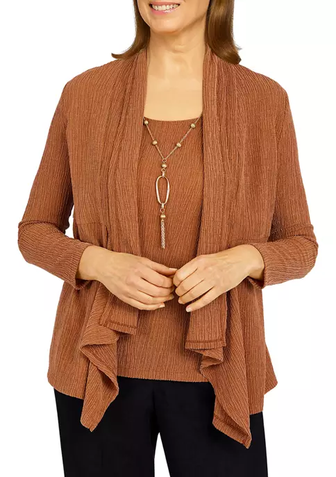 This beautiful new chic crinkle texture two-for-one top from Alfred Dunner is modern and effortless. Features 3/4 sleeves, a cascading hemline, and a striking gold detachable necklace.
