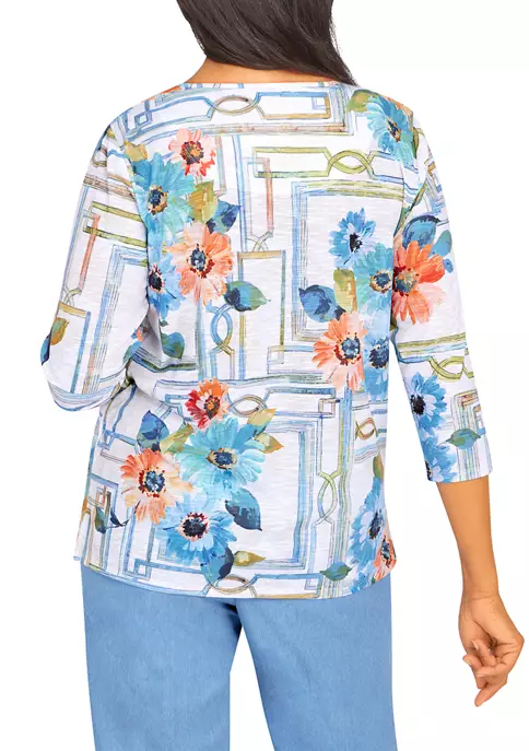 This whimsical windowpane floral print top from Alfred Dunner is sure to bring life to your wardrobe. A cutout embellished crew neckline gives this knit top a unique twist with comfortable 3/4 length sleeves.