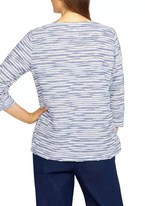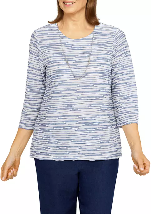 This print top adds a textured look to keep you trendy this season. Features 3/4 sleeves and a detachable necklace at the crew neckline.