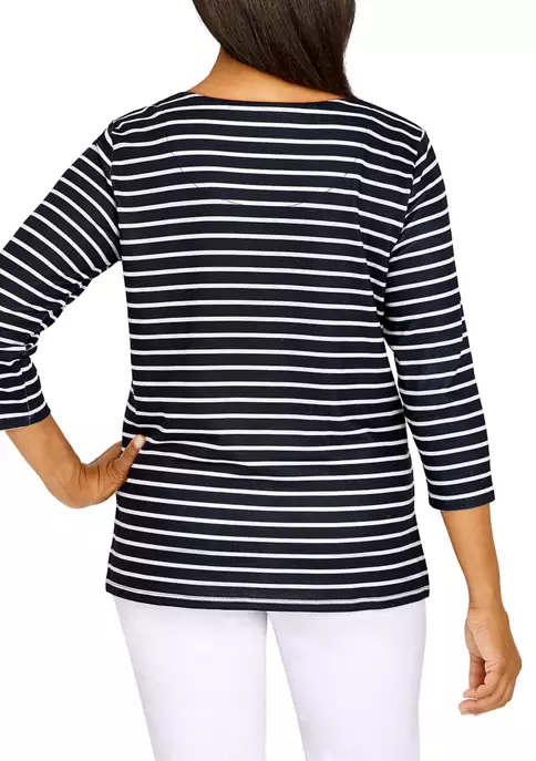Gorgeous blooming florals on a contrast stripe background easily allow the print to pop on This Alfred Dunner soft knit top. Features include 3/4 sleeves and subtle beading at the crew neck.