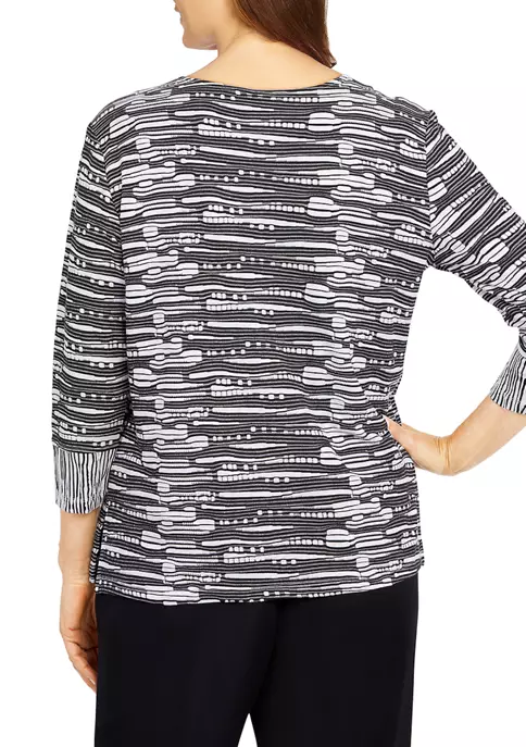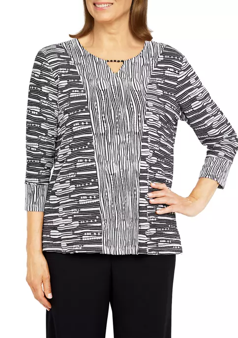 This soft knit top from Alfred Dunner captures a unique spliced texture pattern in a trendy style. Features include 3/4 sleeves and a beaded split neck.