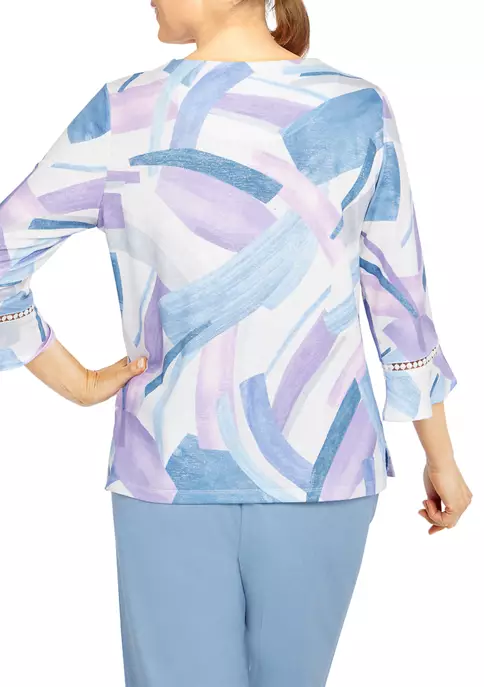 Enhanced with an allover shimmer, you will feel comfortable and beautiful in this abstract brushstroke print top. Features a lace inset at the crewneck and three-quarter bell sleeves.