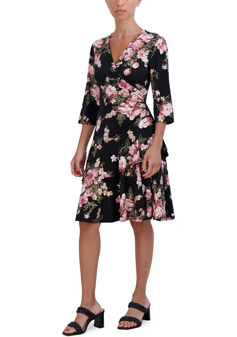 A bright pink and metallic floral shines on a black background on this fit and flare dress from Robbie Bee. Accessorize with a simple gold bangle and sandals for your next occasion.