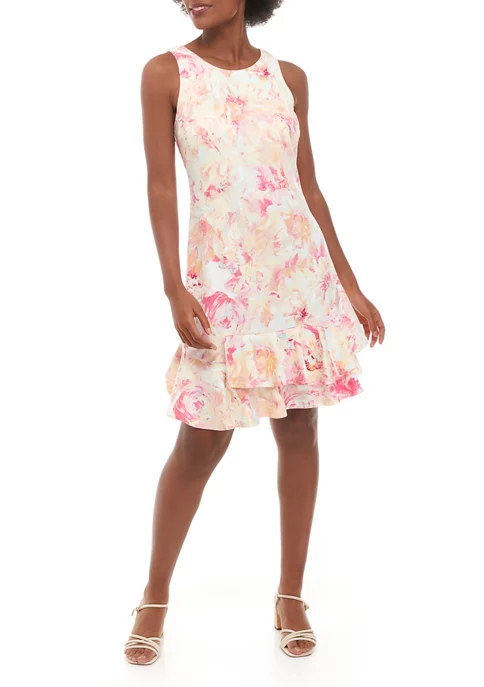 A wonderful watercolor floral print refreshes this sleeveless dress from Robbie Bee, finished in a pretty ruffled hem.