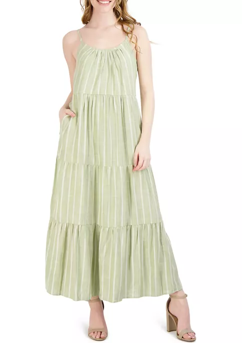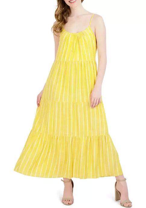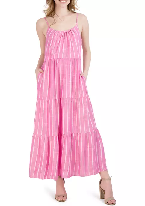 A tiered skirt offers ample breathability to this maxi dress from Robbie Bee that’s covered in dimensional stripes.