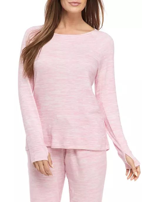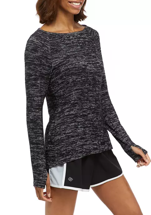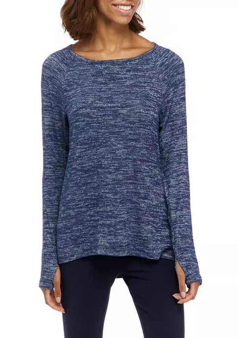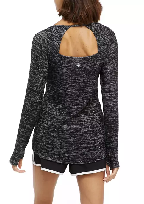 Soft hacci knit fabric and an open back design enhance the comfortable craft of this long sleeve top from ZELOS.